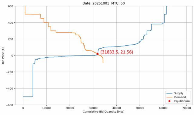 Figure 1: Simulated Supply and Demand aggregated curves for 12h15, October 1st, 2025, in Spain.