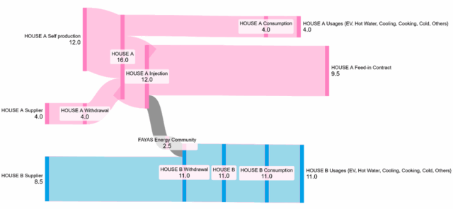 As an example, below is how energy is shared among members of the Energy Community for one of the residential demonstrators, based on available annual data. HOUSEHOLD #1 participates in the Energy Community as the sole producer by injecting its PV production surplus to the grid, with priority given to selling energy to HOUSEHOLD #2, and selling the remaining surplus within the framework of a subsidised feed-in contract, as shown in the figure below.